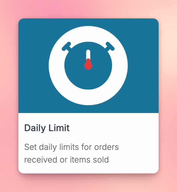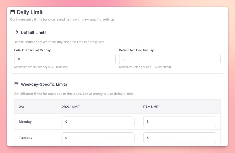 Set daily limits for orders or items per day. Turn the module on in your settings and define default limits, then optionally set different limits by weekday (e.g. higher on weekends) or by specific dates (e.g. holidays or events).
