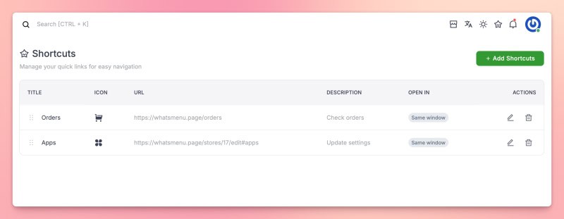 Add custom shortcuts in the top navigation bar for the pages you use most. Create links with a title and icon, reorder them with drag-and-drop, and they appear right in the navbar for you and your team.